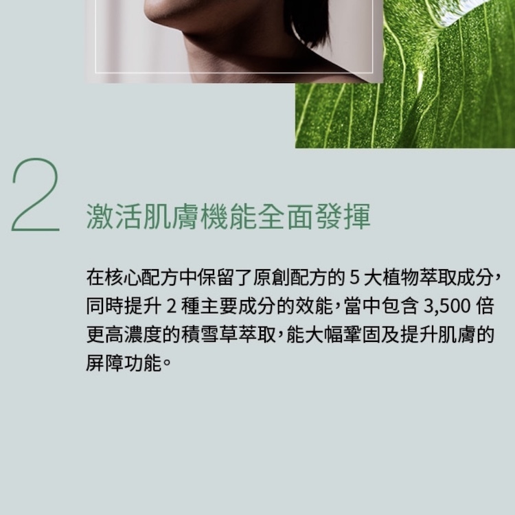 其配方採用了植物提取物和精油的組合。這些成分共同作用,為皮膚提供多重益處。配方中的主要植物提取物包括积雪草、人蔘、迷迭香、啤酒花和鐵角蕨。這些植物提取物有助於刺激和再生皮膚,促進更年輕和光彩焕發的膚色。